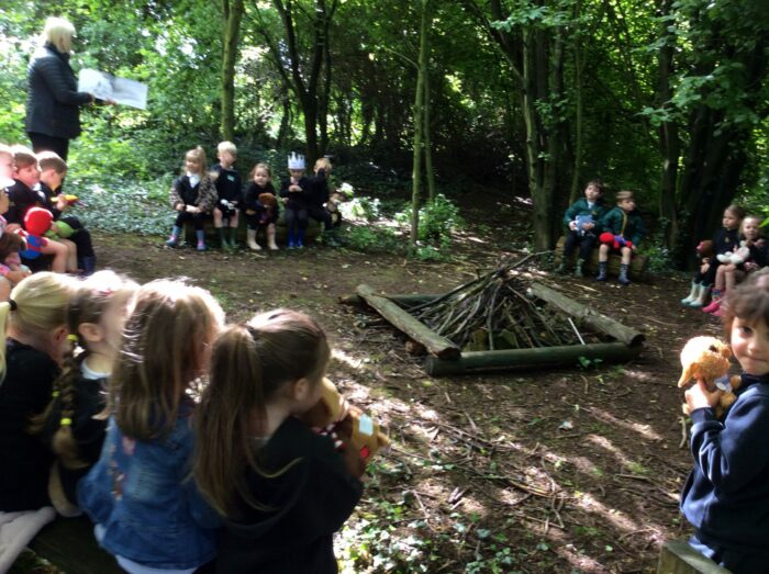 The children brought a teddy bear/soft toy into school; we then went and listened to the story ‘We’re Going on a Bear Hunt’ in our forest area. The children were very good at retelling the repetitive parts of the story. We then revisited adjectives and identified these in the book so that we could go back to class to write words to describe our teddies/soft toys.