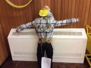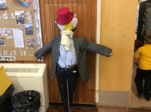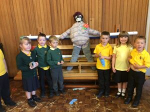 Robins and Chaffinches launched their new topic about Harvest and growing with a Scarecrow-making day. Children were presented with a problem set for them by a real life Farmer. Farmer Andrew sent a video asking the children to help him to protect his crops. Eight teams of children worked well together to produce a variety of scarecrows. Some friendly, some not, some tall and some small. Lots of fun was had. At times, however, it was a challenge to actually see the hall floor!